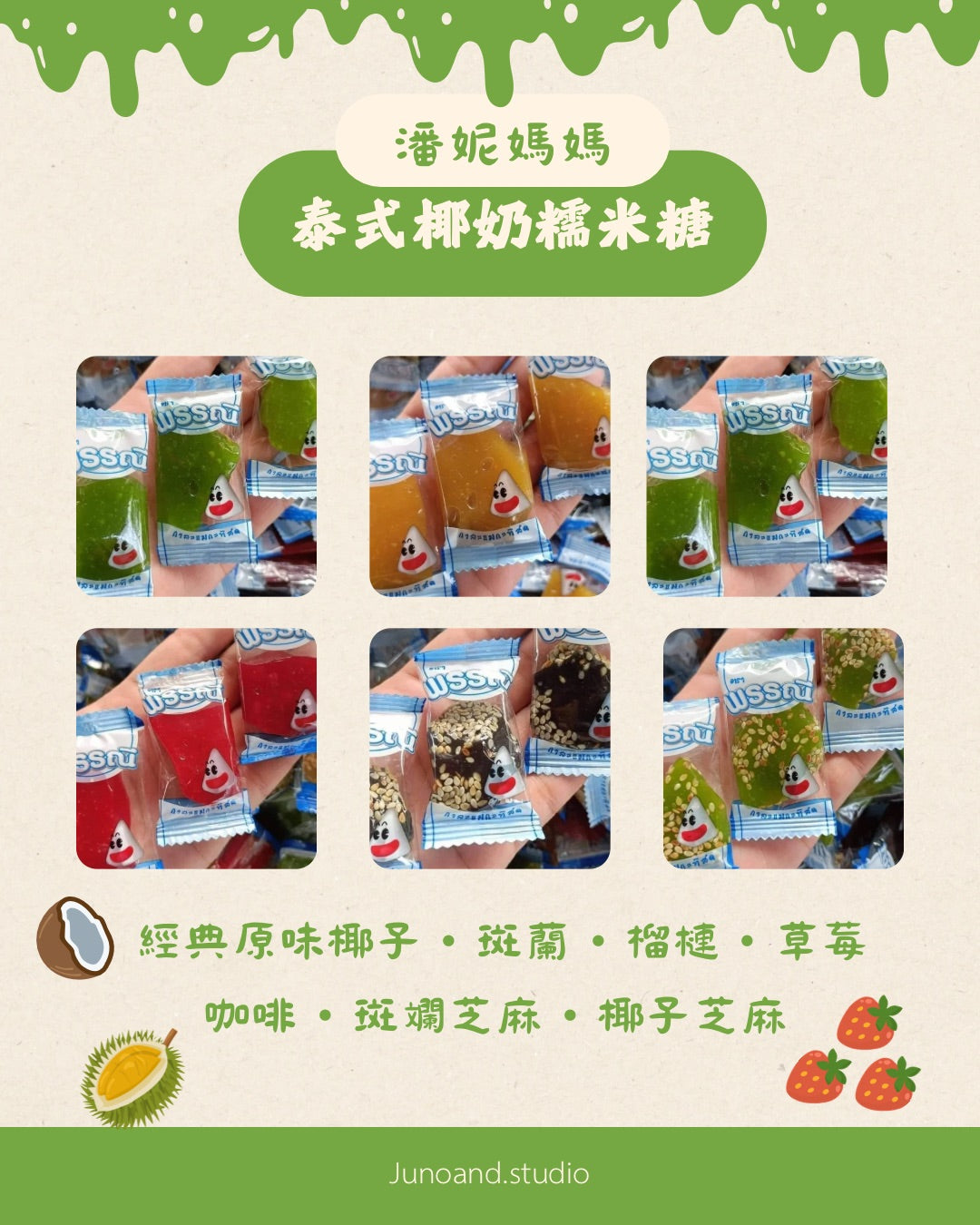 A popular Thai souvenir! Kalamae Pannee uses traditional methods to slowly simmer coconut milk and sugar, resulting in a chewy, thick texture with a rich coconut flavor and a sweet but not cloying taste. It's a perfect snack, a great accompaniment to tea or coffee, or a wonderful gift.